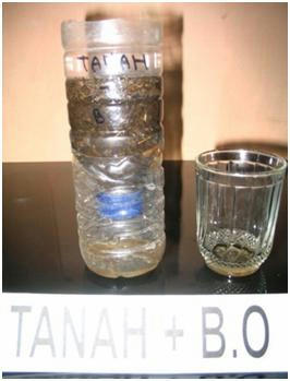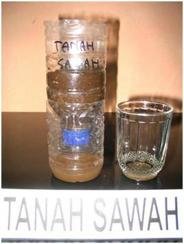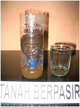 b. Selanjutnya tanah tersebut dimasukan kedalam wadah plastik atau botol bekas air kemasan yang telah dibagi 2 dan diberi lubang kecil kecil dibagian bawahnya agar air dapat meresap dan menetes. Air yang menetes ditampung dalam wadah plastik.