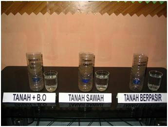 d. Selanjutnya kita amati waktu dan volume air yang tertampung. Tampak tanah yang mengandung bahan organik diperlukan waktu kurang lebih 15 menit dan air yang menetes kebawah relatif sedikit. Tanah sawah agak lambat tapi setelah cukup waktu sampai 1 jam air yang tertampung cukup banyak, sedangkan tanah yang berpasir sangat cepat dan air yang tertampung paling banyak. Semakin sedikit air yang tertampung memperlihatkan bahwa tanah tersebut memiliki kemampuan mengikat air yang lebih baik, dan hal tersebut diperlihatkan oleh tanah yang banyak mengandung bahan organik.